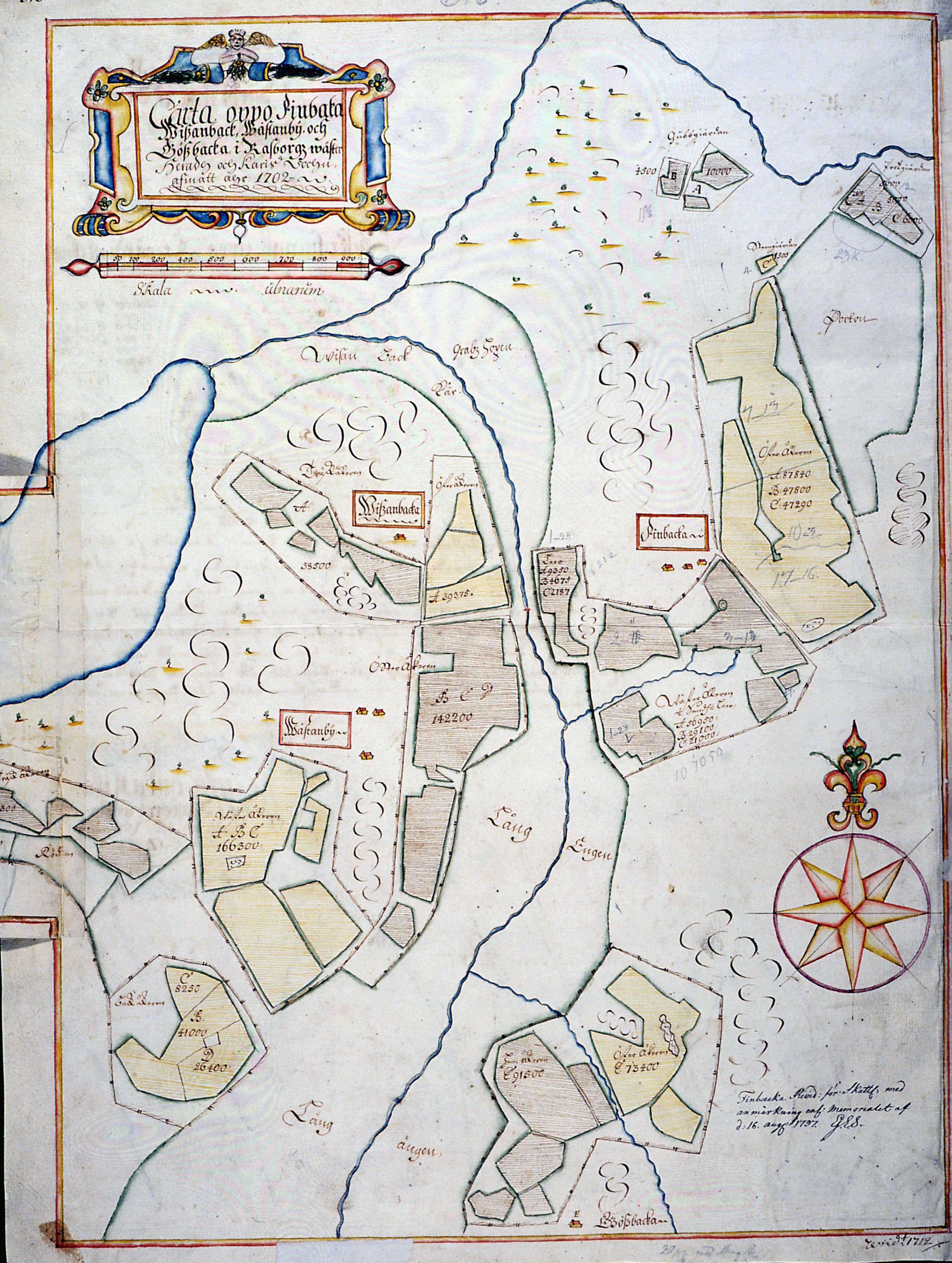 Kartta Karjaan pitäjän Finbackan, Visanbackan, Västanbyn ja Gösbackan kylistä 1702.