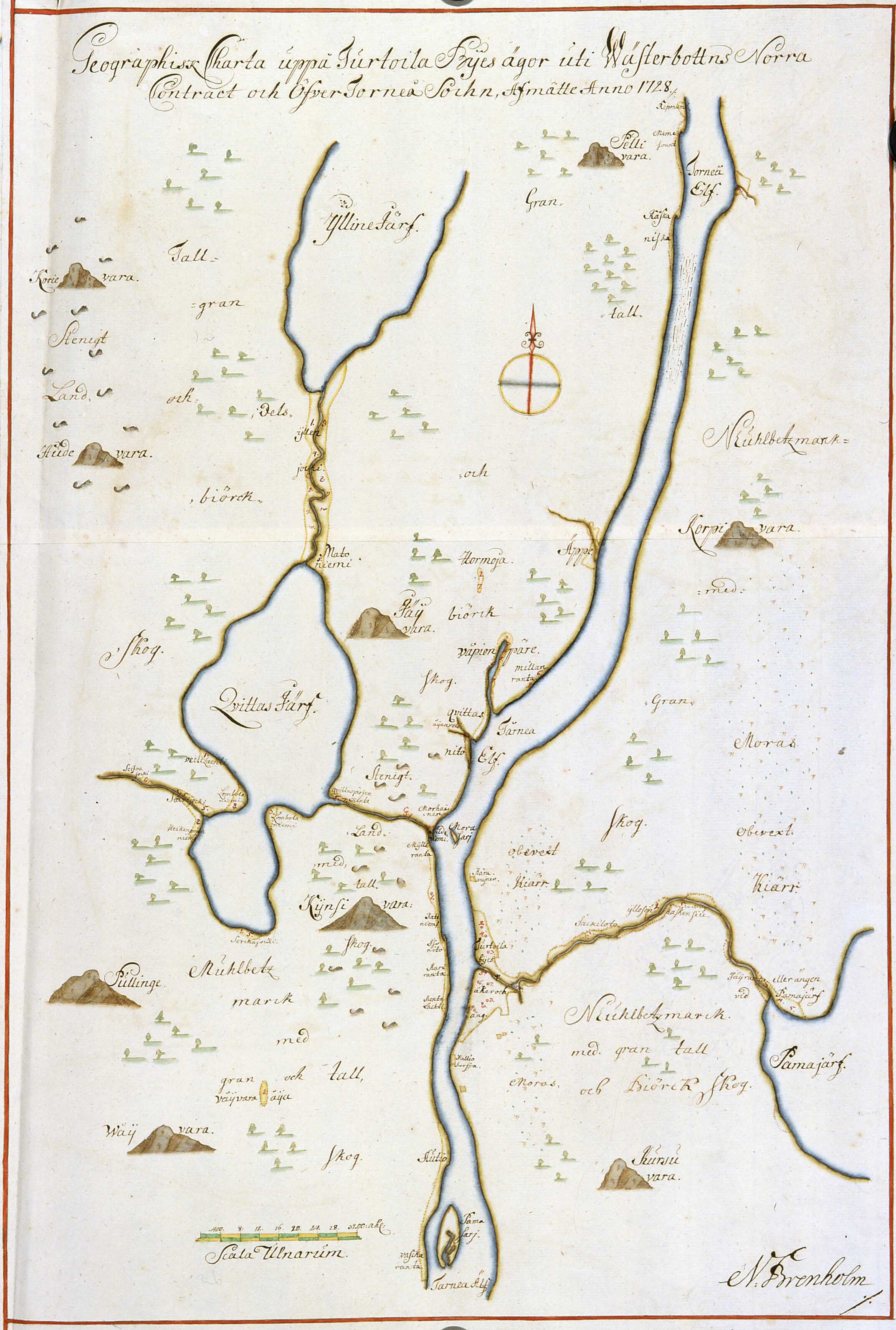 Lähteet: KA. MHA. L23 8/1. Geographisk Charta uppå Turtoila Byes ågor uti Wästerbottns Norra Contract och Öfver Torneå Sochn. Afmätte Anno 1728. N. Brenholm; Ekstrand, Viktor, Svenska Landtmätare 1628—1900. Biografisk förteckning. Umeå & Uppsala 1896—1903; Outhier, Reginald, Matka Pohjan perille 1736—1737. Helsinki 1975; Teerijoki, Ilkka, Maatalouselinkeinot ja maatalouspolitiikka. Tornionjokilaakson historia II. 1600-luvulta vuoteen 1809. Jyväskylä 1993; http://www4.rovaniemi.fi/lapinkavijat/maupertuis/index.html.