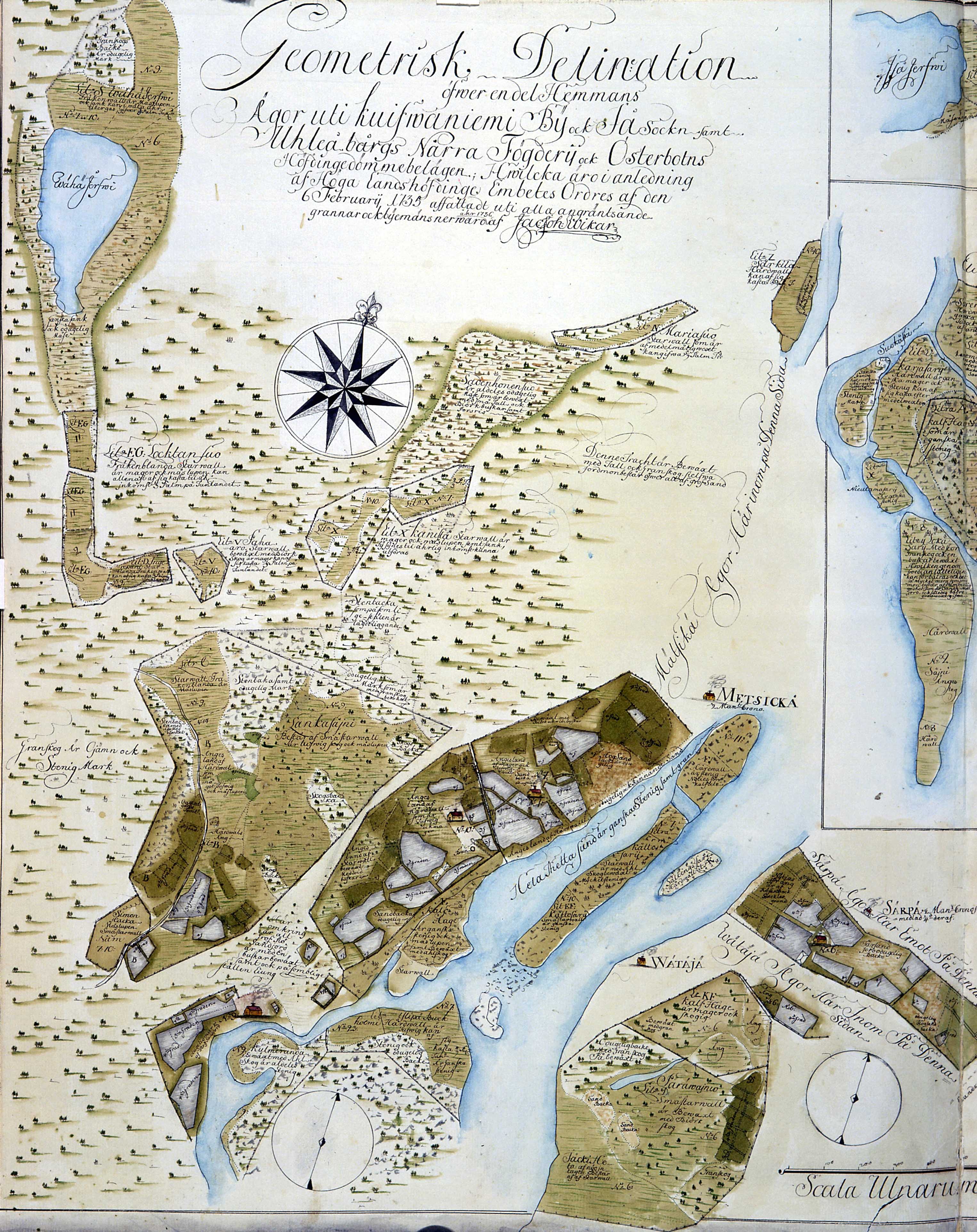 Jakob Vikarin piirtämä kuvaus ”Geometrisk Delineation öfwer en del Hemmans Ägor uti Kuifwaniemi By och Iå Sokkn samt Uhleobårgs Nårra Fögderij och Österbotns Höfdingedömme belägen, Hwilka åro i anledning af Höga Landshöfdinge Embets Orders af den 6 Februarij 1735 affattad uti alla angränsande grannar och byemäns nervaro åhr 1736 af Jakob Vikar” valmistui vuonna 1736. Se noudatti varsin tarkoin vuonna 1725 annetun maanmittausjohtosäännön kartoitusohjeita. ”Maanmittaritalun” pystyttämisen jälkeen kartoittajan oli ”vedettävä oikea pohjoisviiva, joka on puolipäivänviiva, vaan ei magneettineulan osoituksen mukaan”, koska se poikkeaa oikeasta pohjoisviivasta. Vikar sijoitti Kuivaniemen kylän kartalle kaksi puolipäivänviivaa ja kompassiruusun Kuivajoen länsipuolelle sekä kompassinuolet joen itäpuolelle ”Miettulan saateen”, joka on historian saatossa kuivunut ja maatunut umpeen. Miettulan talo (n:o 9) sijaitsee kartan alareunassa. Se omisti Brusilan (n:o 6) ja Karjalaisen (n:o 10) talojen kanssa niittymaita Vähäjärven ympäristössä ja Myllyojan puron varrella. Myllyoja laski vetensä Miettulanlahteen.